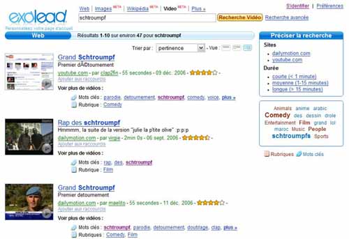La "zapette" sur la droite permet de restreindre sa recherche à une ou plusieurs sources, aux vidéos de courte, moyenne ou longue durée. Un nuage de mots-clés façon Web 2.0 permet, comme dans la recherche Wikipedia, de sélectionner les vidéos se rapportant à un tag ou une catégorie donnés. François Bourdoncle, PDG d'Exalead, explique : "le fait d'harmoniser les catégories est très utile puisqu'on peut affiner d'un seul coup sur une rubrique sur toutes les plateformes existantes, et nous sommes le seul moteur à permettre ça. Idem pour les tags."