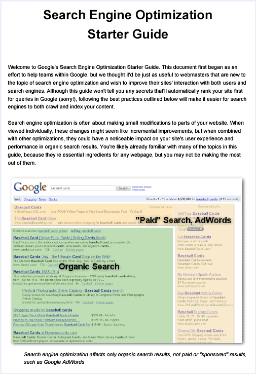 Dans un post intitulé Google's SEO Starter Guide, les équipes des Webmaster Tools de Google nous proposent de télécharger un document intitulé "Search Engine Optimization Starter Guide" qui explique en 22 pages l'essentiel de ce qu'il faut savoir sur l'optimisation d'un site pour les moteurs de recherche.