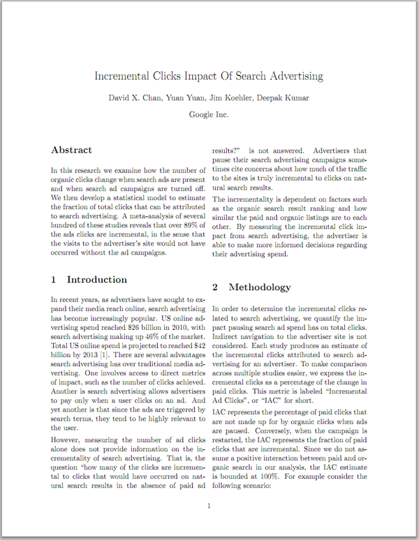Les équipes du Dr. Varian, Chief Economist de Google (et plus particulièrement les dénommés David X. Chan, Yuan Yuan, Jim Koehler et Deepak Kumar), ont publié la semaine dernière une étude baptisée "Incremental Clicks Impact Of Search Advertising", (téléchargeable au format PDF ici) et qui a pour ambition - en se basant sur l'étude de 400 campagnes différentes - de répondre à cette question : "si, pour un mot clé donné, je suis déjà classé en 1ère position en référencement naturel sur Google, cela vaut-il vraiment la peine que j'investisse dans des liens sponsorisés sur ce terme ?".