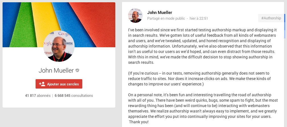 C'est John Mueller (qui, soit dit en passant, semble de plus en plus prendre la place de Matt Cutts pour ce qui est de la communication SEO chez Google) qui l'annonce officiellement dans un post sur Google+ le moteur de recherche arrête ses expérimentations sur l'Authorship et ne prendra plus en compte les données fournies par les liens et attributs "rel='author'" dans le futur.