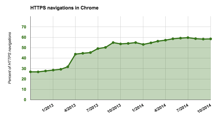 Sur le navigateur Chrome, ce nombre de requêtes est passé pour sa part de 27% à 58% en deux ans à peine. Bien sûr, le fait que Google chiffre aujourd'hui ses pages de résultats est pour beaucoup dans ces statistiques. De même, la rumeur puis l'annonce indiquant que Google devrait prochainement donner un avantage aux sites sécurisés dans ses classements a pu générer un phénomène de fond, notamment depuis cet été, qu'il est aujourd'hui difficile d'ignorer...