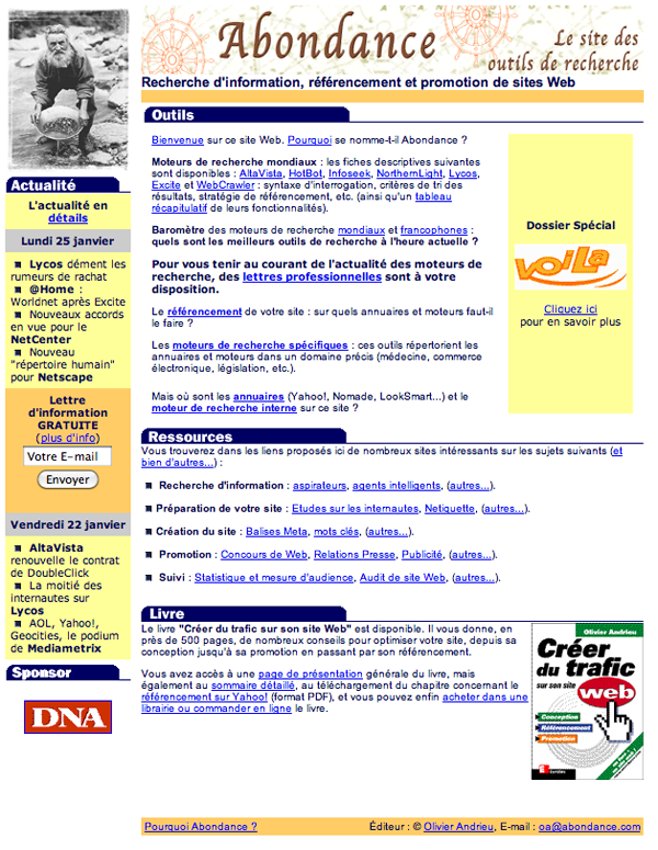 Marrant de voir la promo du livre : Créer du trafic sur son site Web (sur le screenshot du site Abondance de 1996). C’est le premier livre que j’ai lu sur le référencement (en 2004).