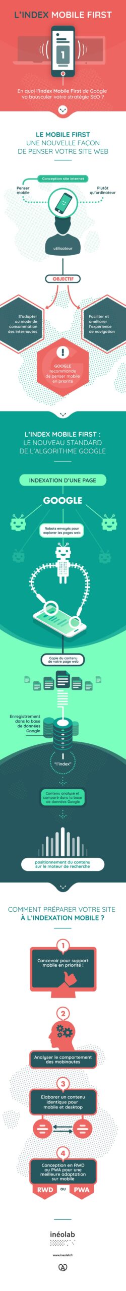 Notre infographie du vendredi est proposée aujourd'hui par le site Ineolab et a pour vocation de vous en dire plus sur l'index Mobile First de Google en cours de déploiement et qui verra le moteur "switcher" depuis la version desktop vers la version mobile des sites web pour son analyse : définition, explications, stratégie à mettre en place, fonctionnement, objectif, préparation, etc. Bref, vous en saurez plus sur cette étape essentielle dans l'évolution de Google grâce à cette infographie (cliquez sur l'image pour en obtenir une version agrandie) :