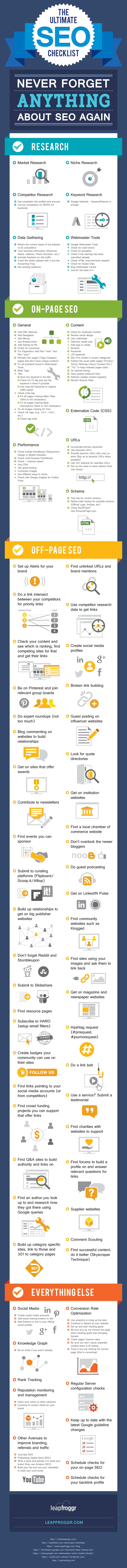 Elle regroupe donc une liste regroupant bon nombre de conseils dans plusieurs catégories : études de marché, recherche de mots-clés, optimisation du contenu, optimisation des performances, techniques de création de liens, médias sociaux, optimisation du taux de conversion et Analytics. De quoi trouver certainement certaines actions que vous aviez oublié ou négligé…