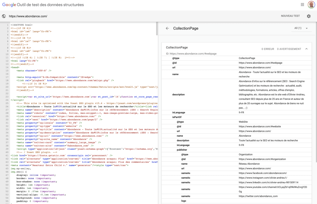Exemple de test sur les balises de données structurées d'une page web. Source de l'image : Abondance