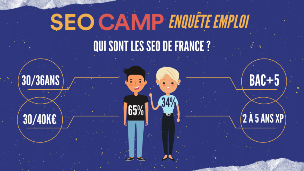 D'une façon plus générale, les personnes qui font du SEO en France ont entre 30 et 36 ans avec 2 à 5 ans d'expérience, ont un niveau Bac+5 et gagnent 30 à 40 k€ par an. 64% sont des hommes et seulement 34% des femmes, 69% d’entre eux sont en CDI et pour 39% chez l’annonceur, et 30% sont en agence de digital marketing. 44% des répondants se disent être SEO confirmé, 33% expert et seulement 23% se disent junior.