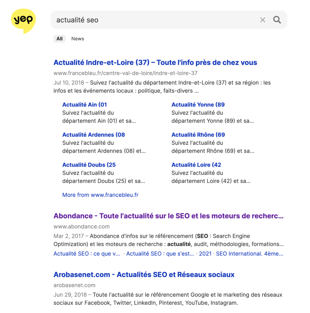 Yep se présente donc comme une alternative à Google ou Bing, utilisant sa propre technologie de recherche. Dans ce sens, il peut être comparé à Brave beaucoup plus qu'à DuckDuckGo ou autres Ecosia, qui sont plus pour leur part des métamoteurs utilisant principalement la technologie de search de Bing.