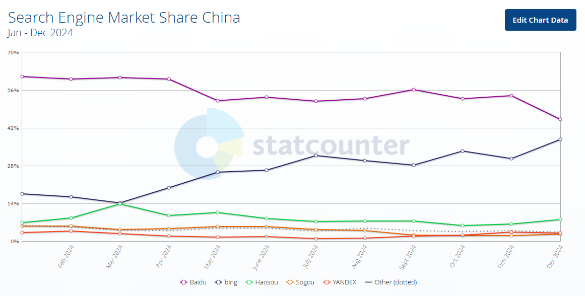 En raison du blocage de Google en Chine, Baidu domine le marché local. Il est optimisé pour le mandarin et offre des fonctionnalités spécifiques comme la reconnaissance vocale avancée et l’indexation prioritaire des sites chinois. Baidu est aussi largement utilisé pour la recherche de musique et de vidéos, avec des intégrations vers des plateformes locales telles que iQIYI et Tencent Video. Sur StatCounter, on note cependant une large baisse de Baidu au profit de Bing en décembre 2024 : Baidu est tombé à 45% tandis que Bing est monté à 37%.