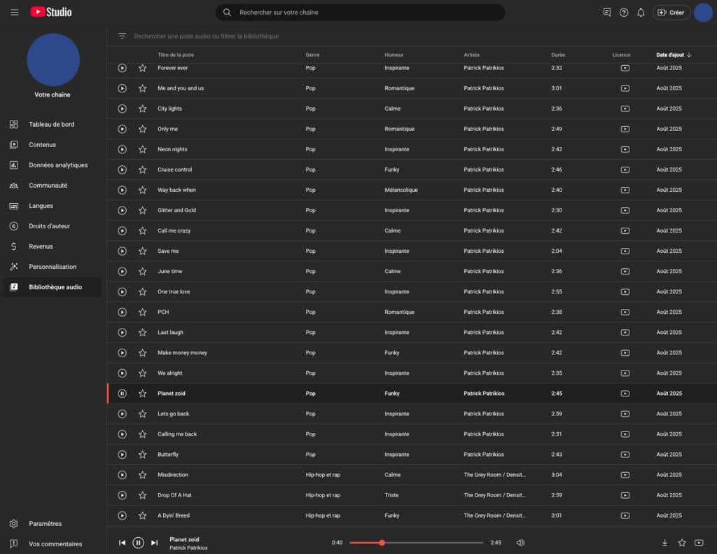 C’est sans doute une des questions qui revient le plus souvent. Si de nombreuses bibliothèques existent, gagnons du temps et concentrons-nous sur une valeur sûre : la bibliothèque audio de YouTube. Vous trouverez cette dernière directement intégrée à votre Creator Studio, et elle vous offre pléthore de titres librement utilisables. Attention cependant, certains nécessitent une mention en description.