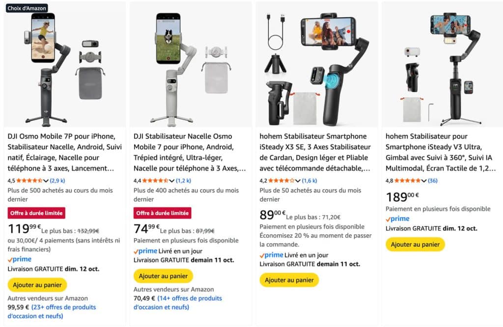 - Un stabilisateur/gimbal : si vous voulez tourner en mouvement, c’est le must-have pour la stabilisation. Désormais, les smartphones proposent une stabilisation logicielle tout à fait satisfaisante, mais l’accessoire reste bien supérieur.
