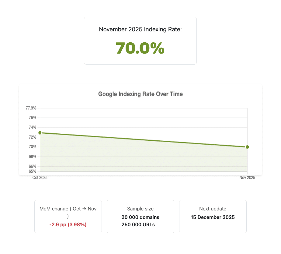 - En novembre 2025, Google n’a indexé que 70,0 % des 250 000 URLs testées, contre 72,9 % en octobre, soit une baisse d’environ 4 % du volume de pages indexées entre les deux mois.