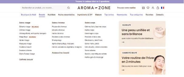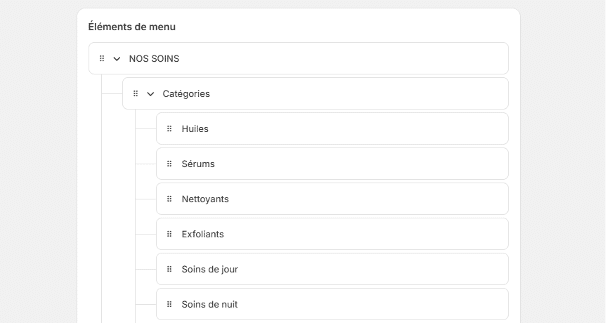 Le menu principal doit refléter fidèlement l’architecture SEO du site. Il doit rediriger vers les collections principales, celles qui correspondent aux grandes thématiques de votre offre (ex. : Soin du visage, Maquillage, Soin du corps).