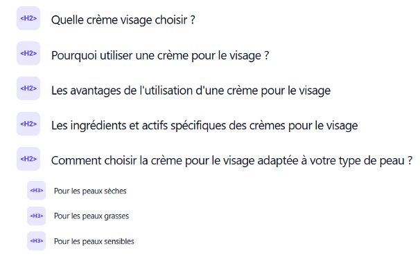Ces formulations contiennent des mots-clés contextualisés, précisent l’intention de recherche et renforcent la pertinence sémantique. Un H2 générique comme “Ingrédients” peut apparaître sur n’importe quelle fiche produit, dans n’importe quelle marque. Google ne saura pas sur quel mot-clé positionner la page. Les H3, eux, servent à structurer les sous-parties (ex. : chaque question d’une FAQ, détails d’un bénéfice produit).
