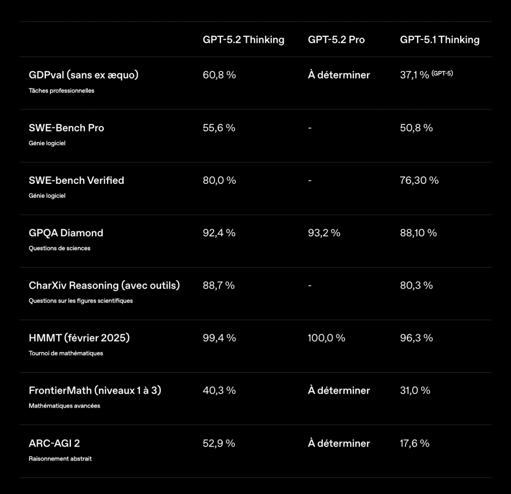- GPT-5.2 Thinking : C'est la véritable star de cette mise à jour. Destiné aux professionnels, ce modèle prend le temps de "réfléchir" pour structurer ses réponses. Il est optimisé pour gérer des projets en plusieurs étapes, manipuler des outils complexes et analyser de grands volumes de données.