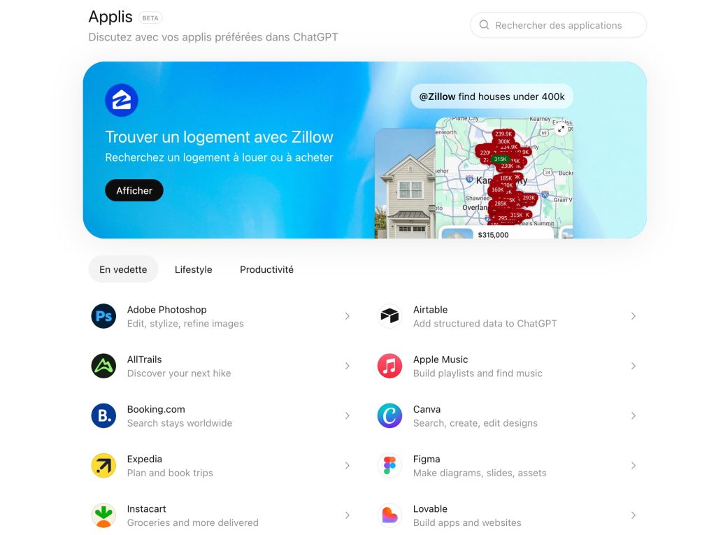 Concrètement, vous pouvez invoquer ces services de deux manières. Soit en les mentionnant directement avec un « @ » dans votre conversation (par exemple @apple-music ou @uber-eats), soit en laissant ChatGPT suggérer automatiquement l'outil le plus pertinent selon le contexte de votre demande. Si vous discutez de rénovation immobilière, l'IA pourrait spontanément vous proposer d'ouvrir l'application Zillow pour consulter des annonces.