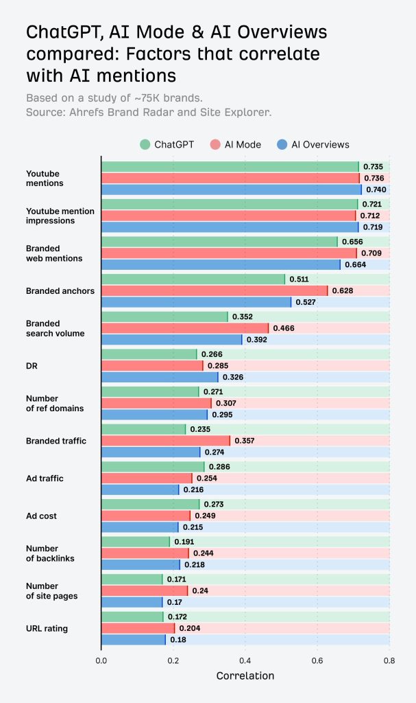 Pour faire simple : si une marque est fréquemment citée dans des vidéos YouTube, elle a statistiquement beaucoup plus de chances d'apparaître dans les réponses de ChatGPT, du mode IA de Google ou des AI Overviews. La corrélation atteint un score impressionnant de 0,737.