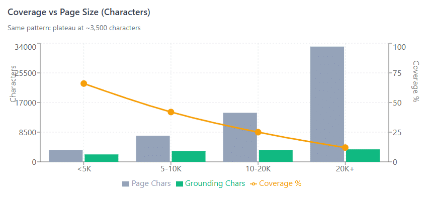 L’un des résultats les plus parlants est la chute de la couverture (proportion de la page utilisée) à mesure que la taille de la page augmente. Dan compare la longueur de la page (en mots et en caractères) au volume de grounding effectif, puis calcule un taux de couverture.