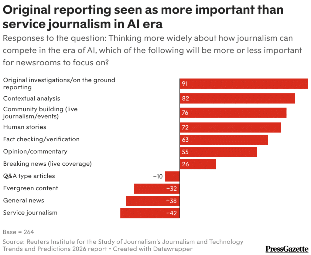 Pour s'adapter à ce nouvel environnement, les éditeurs revoient leurs priorités éditoriales. Les enquêtes originales et les reportages de terrain arrivent en tête des contenus jugés prioritaires, suivis par l'analyse contextuelle et la construction de communautés.