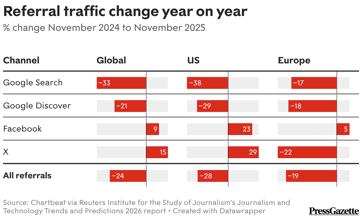 Les chiffres publiés dans le rapport Journalism and Technology Trends and Predictions 2026 s'appuient sur les données de Chartbeat, qui analyse le trafic de plus de 2 500 sites d'éditeurs à travers le monde. La tendance baissière n'est pas nouvelle, mais elle s'est considérablement accélérée. Depuis mai 2023, les referrals depuis la recherche Google ont reculé de 21 % globalement, tandis que l'ensemble des sources de trafic externes a diminué de 24 %.