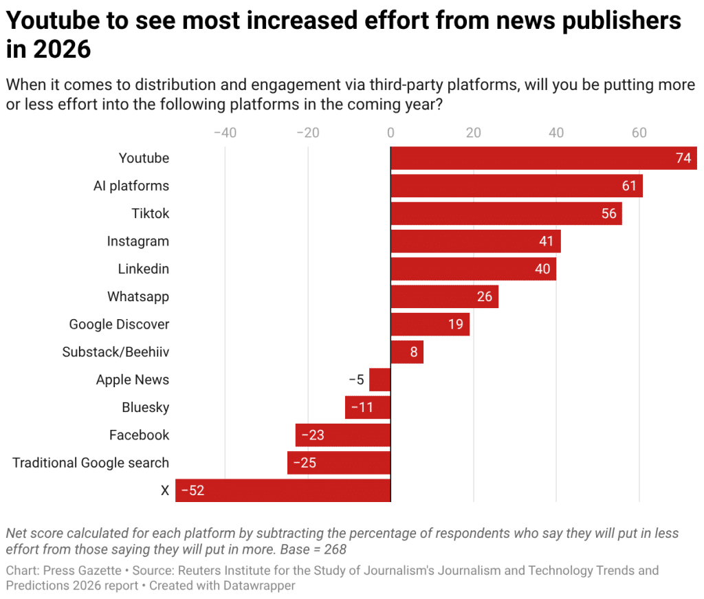 Les éditeurs ont visiblement tiré les conclusions de cette situation : ils prévoient majoritairement de réduire leurs efforts sur Facebook et X en 2026, avec des scores nets respectifs de -23 et -52.