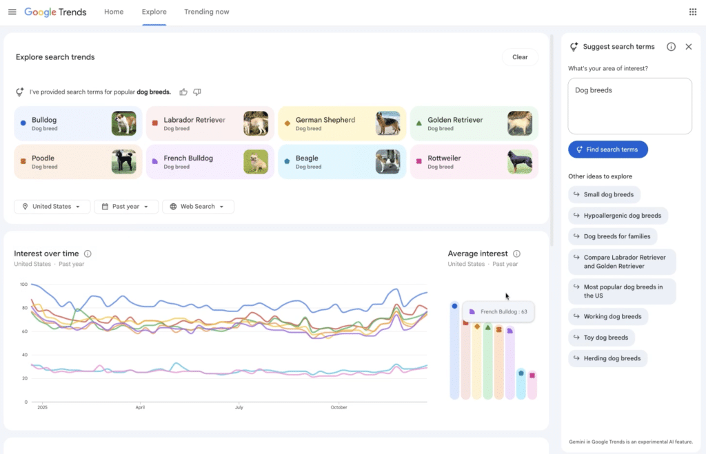 La principale nouveauté réside dans le panneau latéral propulsé par Google Gemini. Lorsque vous recherchez un sujet, l'IA identifie automatiquement les termes associés pertinents et les affiche directement dans le graphique. Par exemple, une recherche sur les races de chiens populaires génère automatiquement des courbes pour « golden retriever », « beagle » et d'autres races tendances.