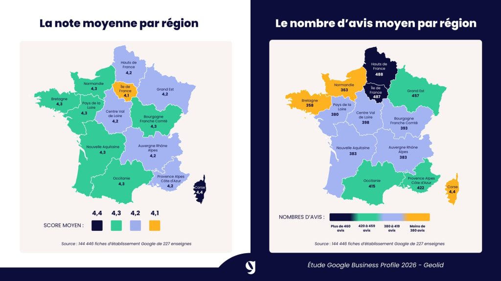 Le volume d'avis varie également considérablement selon les régions, souvent corrélé à la densité démographique. Les Hauts-de-France et l'Île-de-France culminent avec respectivement 488 et 487 avis en moyenne, tandis que la Bretagne affiche 358 avis. Ces régions à fort volume imposent aux établissements une stratégie de collecte plus agressive pour rester visibles.