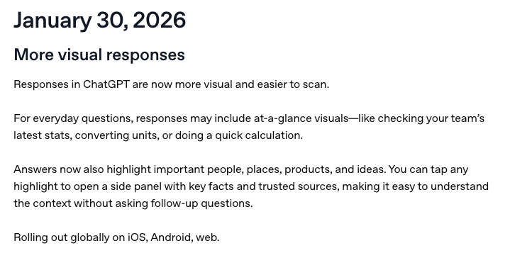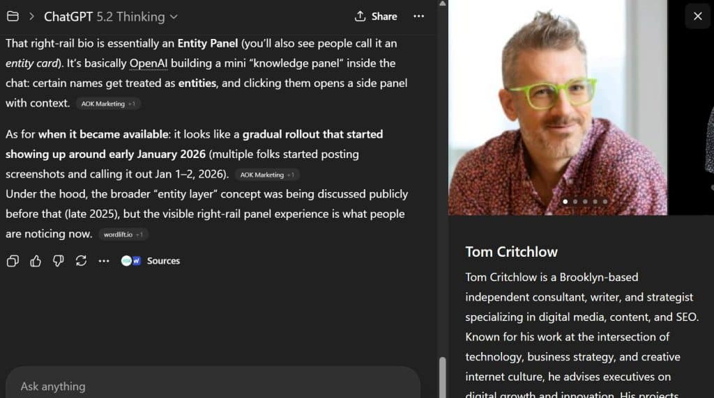 - ChatGPT affiche désormais des panneaux latéraux avec informations clés sur les personnes, lieux, produits et concepts mentionnés dans les réponses