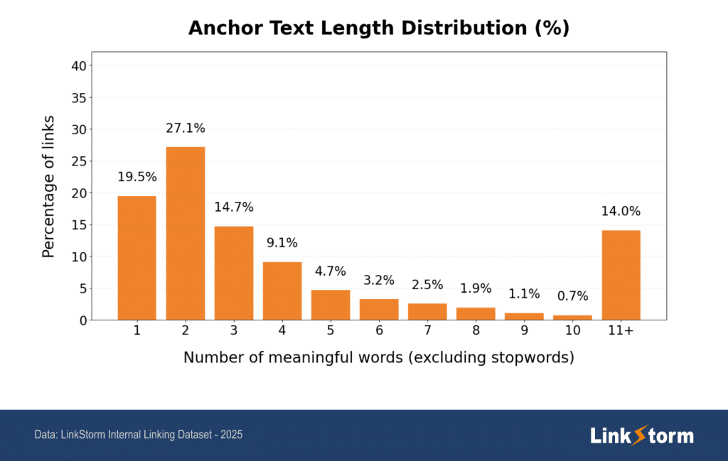 L'étude met en évidence un pattern surprenant : 61% des ancres contiennent 1 à 3 mots significatifs, tandis que 14% en comptent 11 ou plus. Les ancres de longueur intermédiaire, de 5 à 10 mots, demeurent relativement rares.