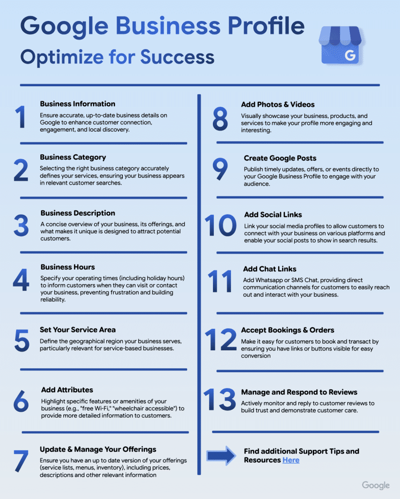 - Google a publié plusieurs guides GBP adaptés par vertical (restaurants, hôtels, activités, services) ainsi qu'un guide généraliste.