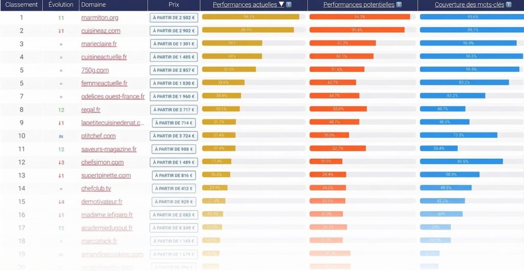 | Domaine | Prix min | Nb requêtes visibles | Score perf. actuelles | Score perf. potentielles | Dif. vs mois précédent |