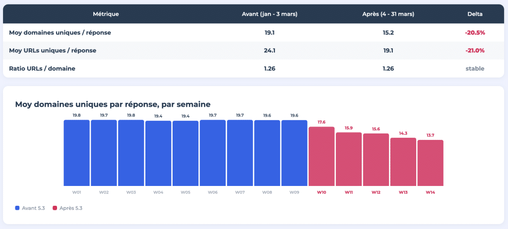 Le 4 mars 2026, ChatGPT a basculé son modèle par défaut de GPT-4o/5.2 vers GPT-5.3 Instant. Résultat : le nombre moyen de domaines uniques cités par réponse est passé de 19,1 à 15,2, soit une chute de plus de 20,%. Le nombre d'URLs uniques par réponse a suivi la même trajectoire, passant de 24,1 à 19,1.