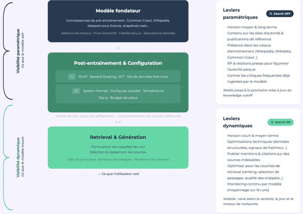 Notre étude présente un framework d'analyse séparant la visibilité paramétrique (ce que le modèle sait grâce à ses données d'entraînement, recherche désactivée) de la visibilité dynamique (ce qu'il récupère en temps réel, recherche activée).