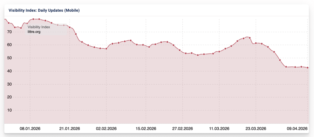 En France : toutelaconjugaison.com (-32%), littre.org (-30%), bab.la (-20%), glosbe.com (-25%), lingolia.com (-15%), kartable.fr (-14%), reverso.net (-12%), francaisfacile.com (-7%). Le cas du Littré est particulièrement symbolique : cette référence historique de la langue française passe d'un indice de visibilité de 61 à 43. C'est une chute brutale pour un site qui fait autorité depuis des décennies.