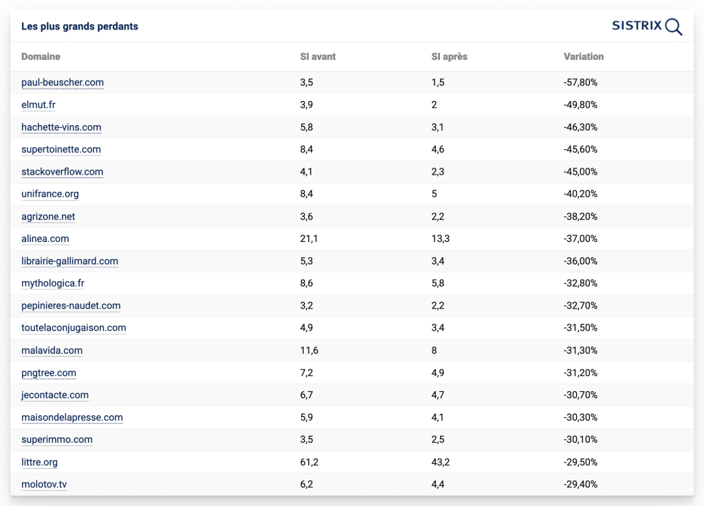 En France, supertoinette.com, le forum de cuisine, perd 46% de sa visibilité. stackoverflow.com recule de 45% sur le marché français. jecontacte.com (-31%) est aussi touché.