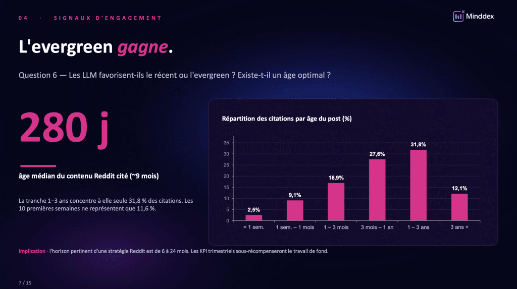L'âge médian du contenu Reddit cité dans l'étude est de 280 jours, soit environ neuf mois. La tranche 1 à 3 ans concentre à elle seule 31,8 % des citations. À l'inverse, les dix premières semaines suivant la publication d'un post ne représentent que 11,6 % des citations.