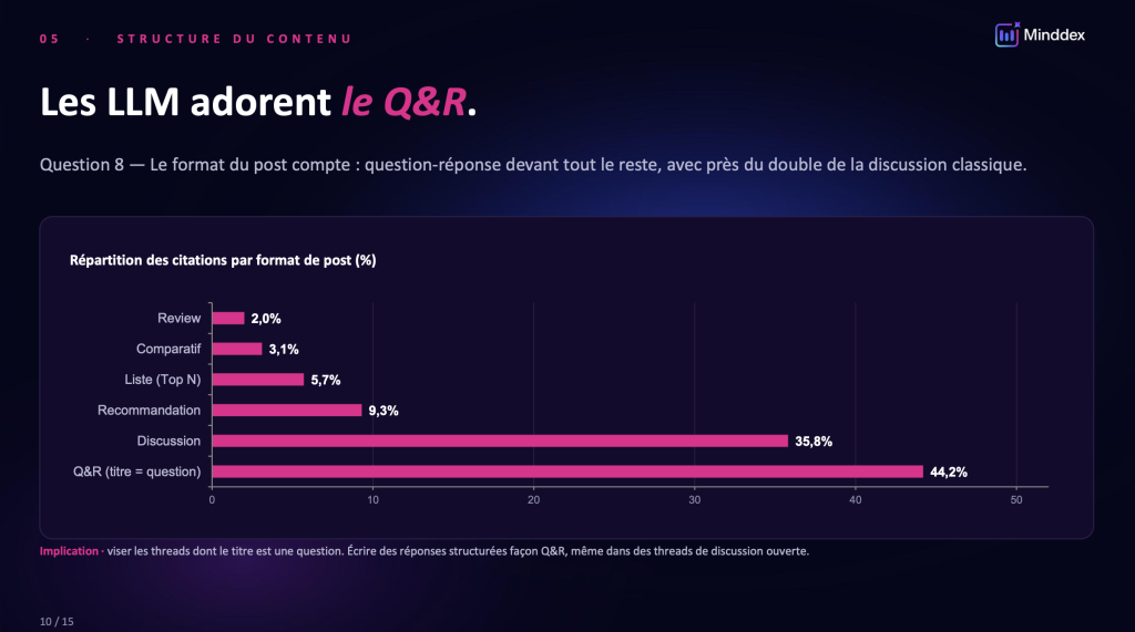 L'étude a également analysé le format des posts dont sont extraites les citations. Le résultat est sans ambiguïté : le format Q&R (posts dont le titre est une question) représente 44,2 % des citations, devant les posts de discussion (35,8 %), les recommandations (9,3 %), les listes (5,7 %), les comparatifs (3,1 %) et les reviews (2 %).