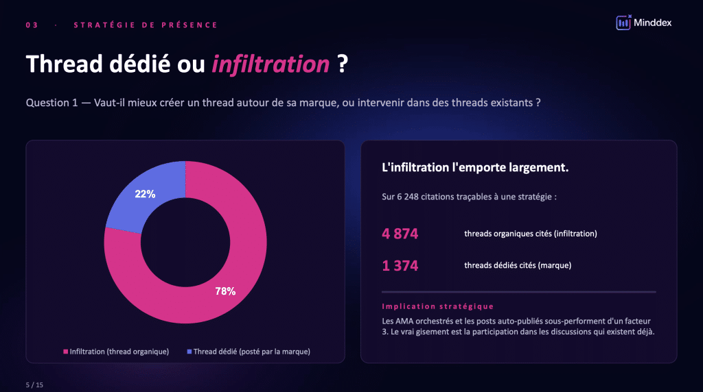 Sur 6 248 citations traçables à une stratégie identifiable, 4 874 pointent vers des threads organiques (discussions nées sans intervention de marque), contre seulement 1 374 vers des threads dédiés. Autrement dit, 78 % des citations viennent de fils dans lesquels la marque est présente par participation, pas par initiation.