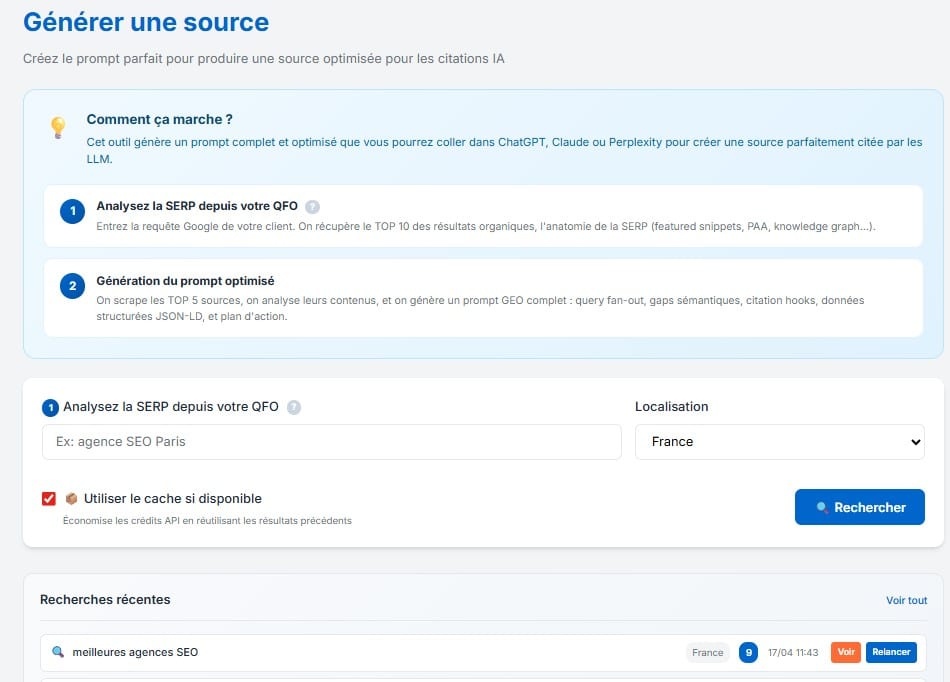 Sur cette base, il génère un prompt GEO prêt à l’emploi, conçu pour forcer la citation : Query Fan-Out pour couvrir toutes les intentions, hooks de citation pour inciter les LLM à reprendre la source, enrichissement en données structurées (JSON-LD), et plan d’action clair.